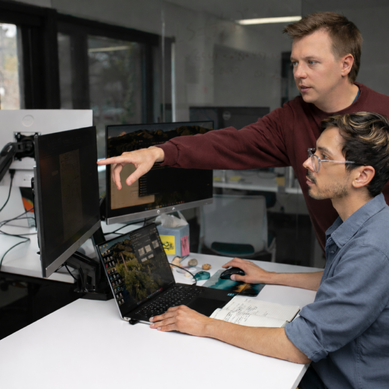 One person types while another points at a computer screen.